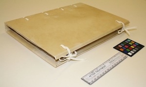 Treatment included: washing, calcium phytate solution bath, alkaline reserve, mending paper tears and then it was reversibly laced into a vellum case.