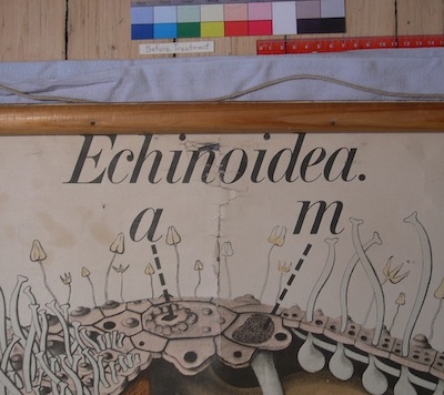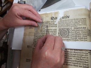 Paper repair includes mending tears and filling losses. Sometimes the paper has to be humidified first, to ease wrinkles and make a better repair. Paper repair takes a very long time.
